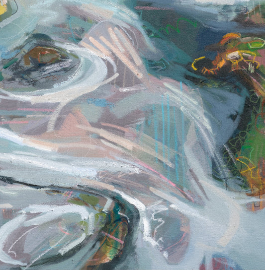 Her process is one of considerable layering. Details being revealed and then replaced by calm, strong colour by muted tones, lines and marks by softer glazes. It’s a continuous push and pull, and a lingering of happiness. The intense flourish of a mark off-set against Shaune's gentler paint brush marks help to depict the natural hum between objects.