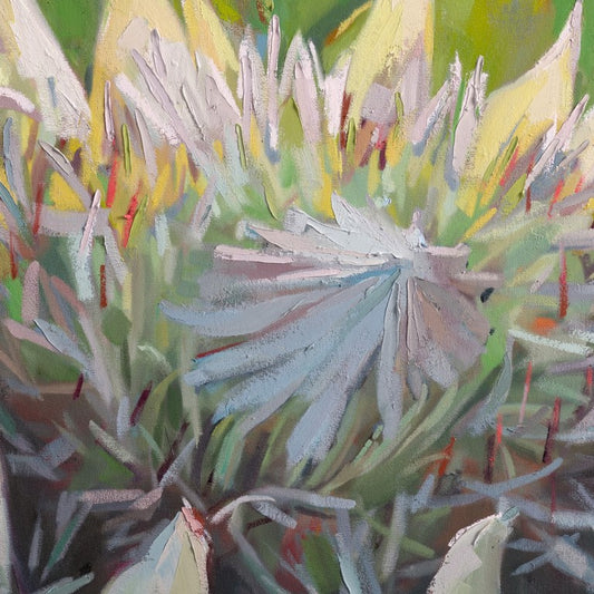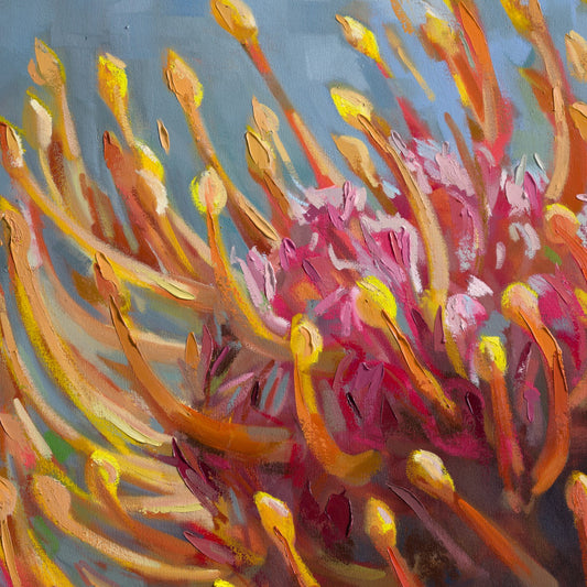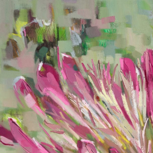 This ongoing series depicts the dynamism and beauty of the indigenous fynbos plants of South Africa. These include flowers such as the protea and pincushion. Using oil paints and oil bars, careful brushwork and bold sweeps of the palette knife, Shaune tracks the light of a single bloom and unpacks an endless supply of inspiration and colour-ways.