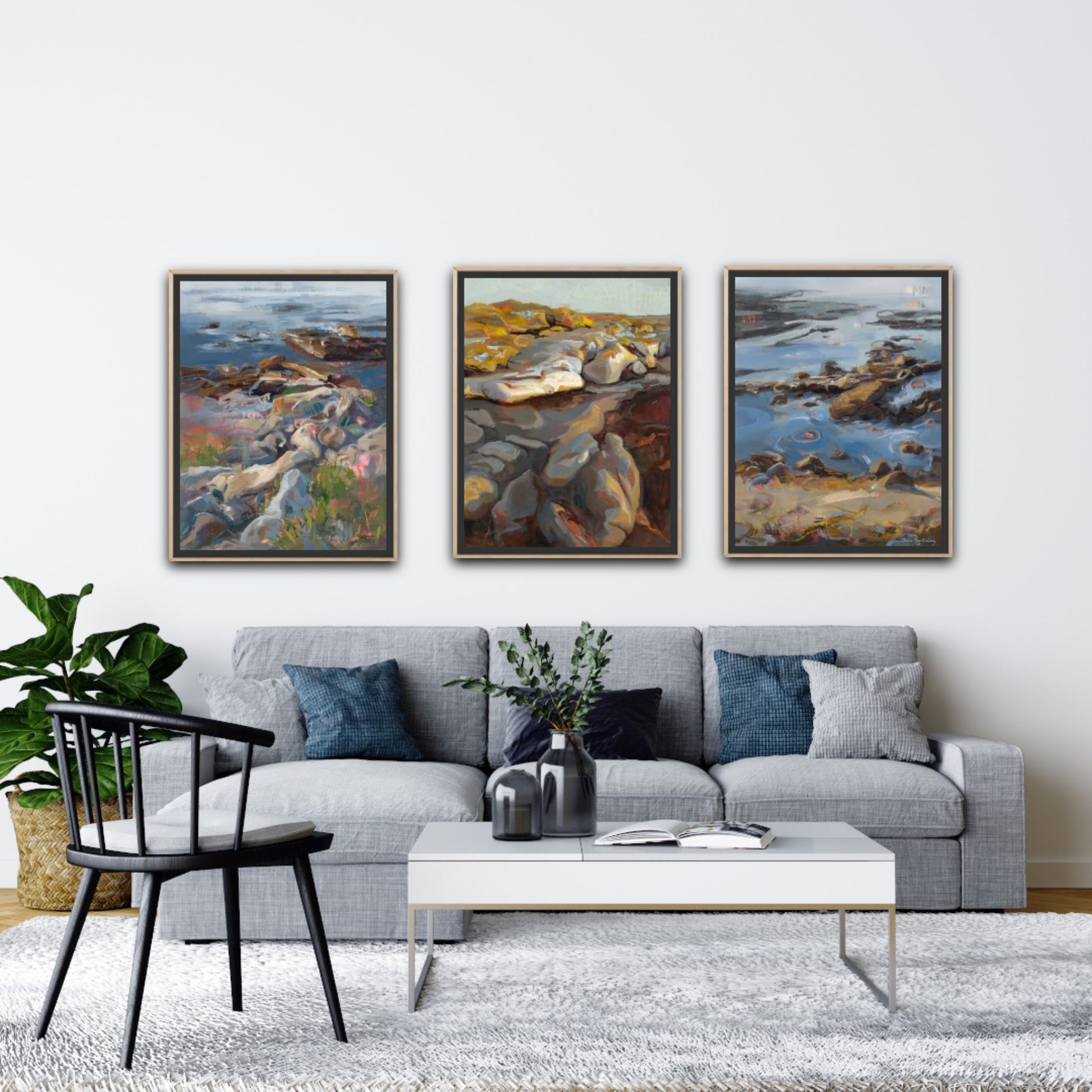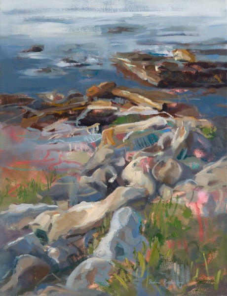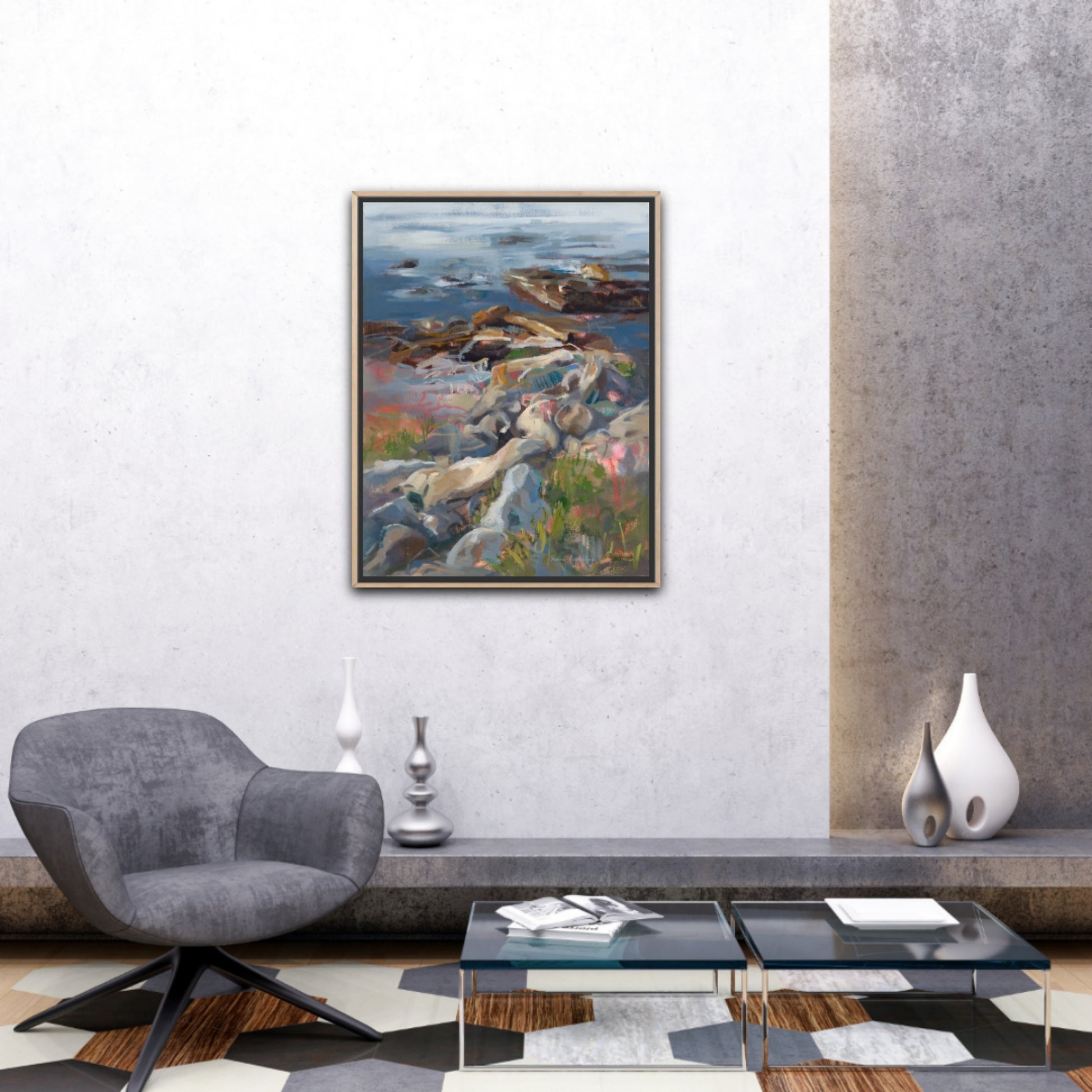 oil and oil sticks on stretched box canvas, beautifully box framed in kiaat wood (framed price)