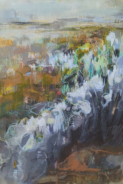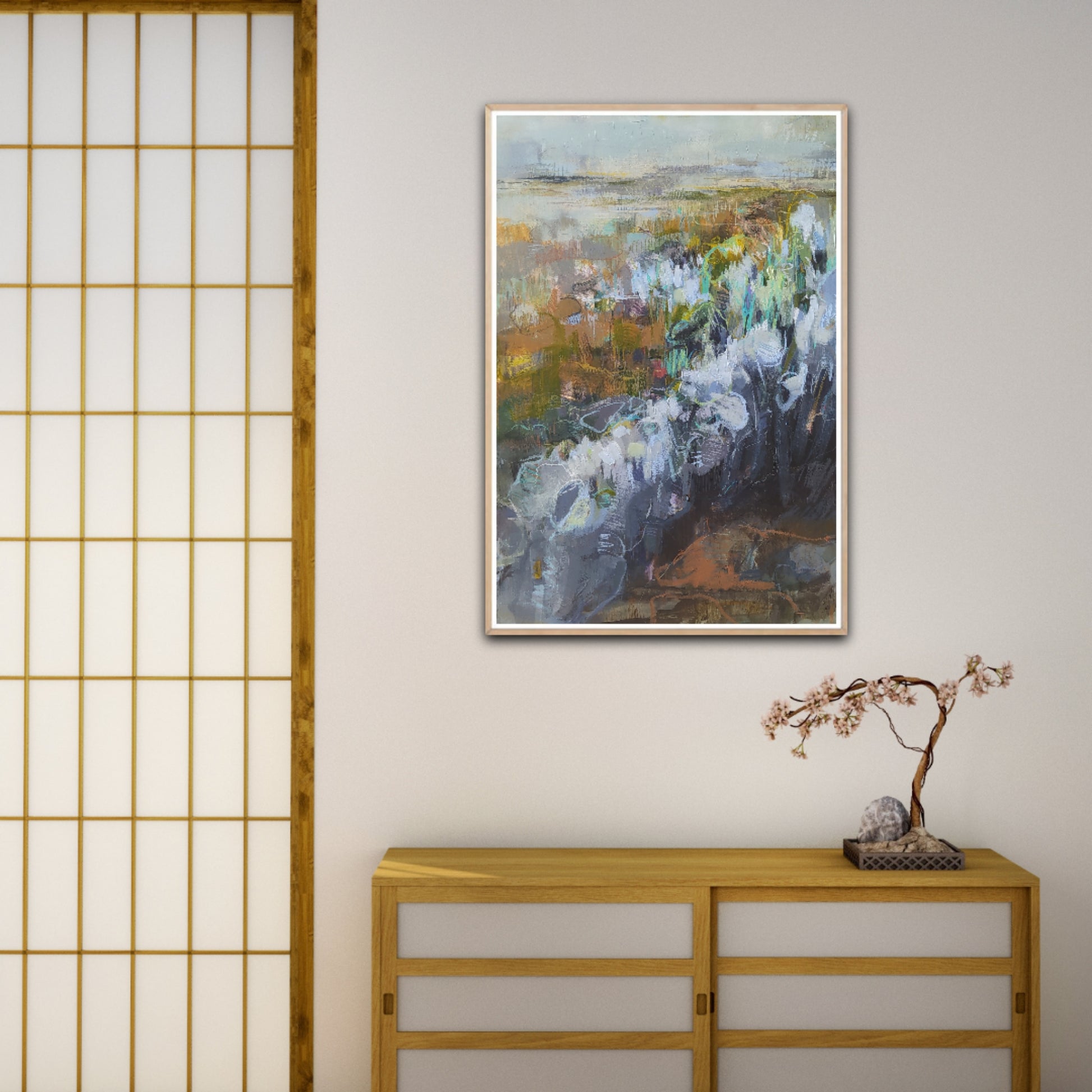 Painting is floated behind glass and framed with kiaat. The mountboard edge has been kept as part of the painting to show the edge workings.