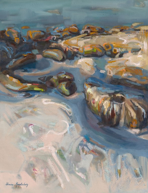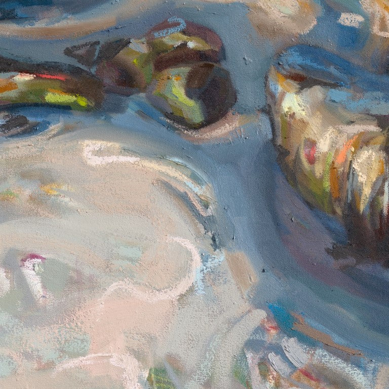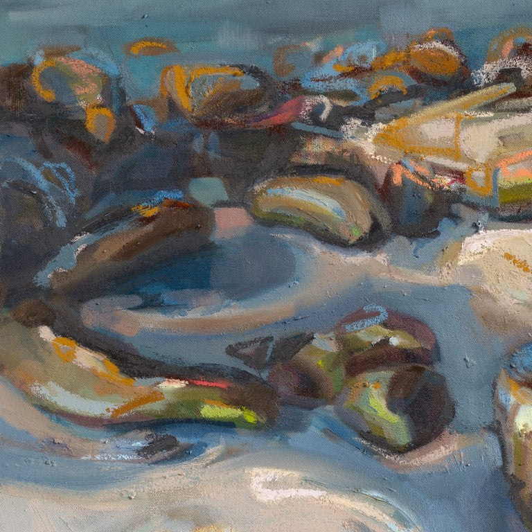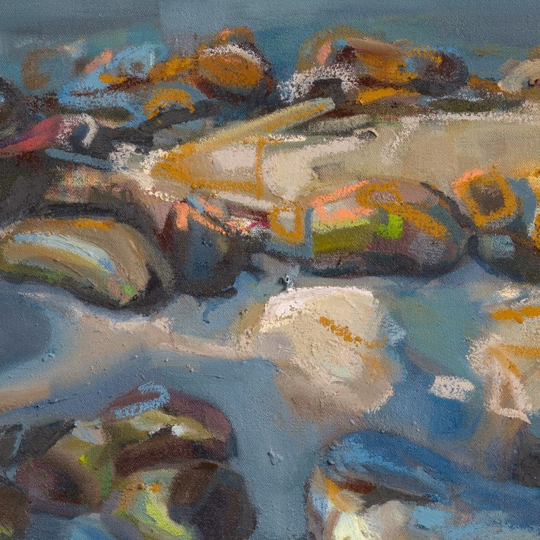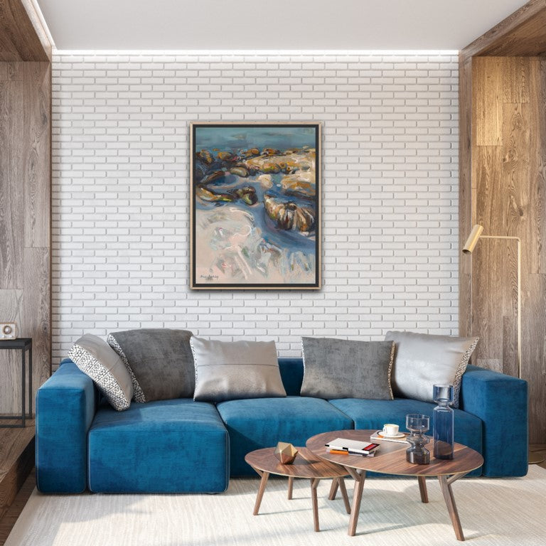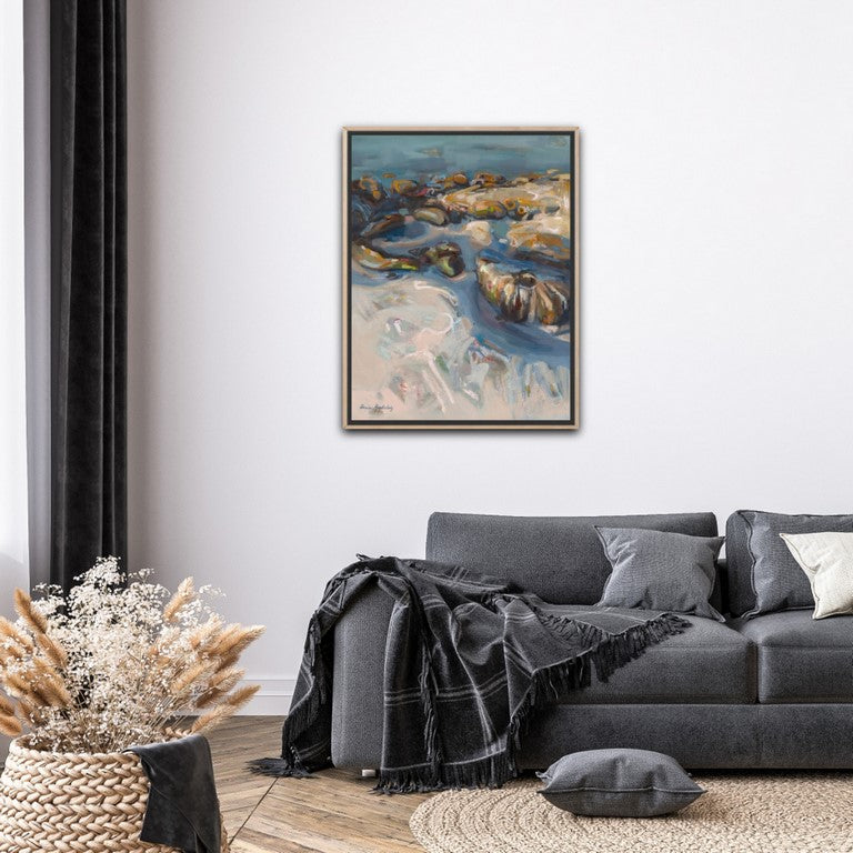 oil and oil sticks on stretched box canvas, beautifully box framed in kiaat wood (framed price)